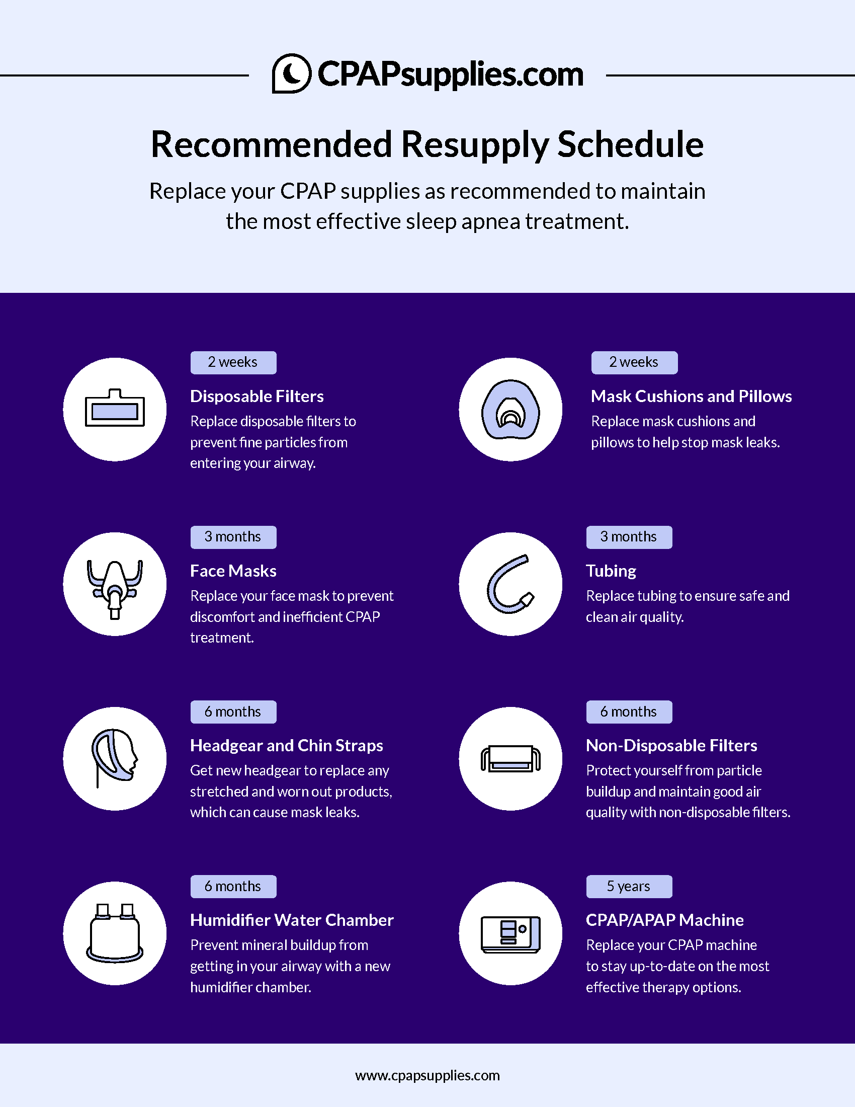 Click here to download our printable 'CPAPsupplies Recommended Resupply Schedule' PDF for your convenience.