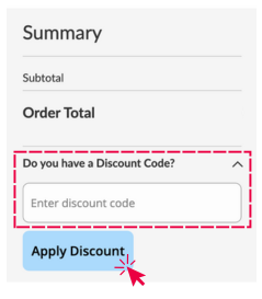 • You must enter the discount code at checkout in the "Do you have a discount code" entry field and click "Apply Discount" in order to receive discounts on eligible products. See image of the location of the discount code entry field below.