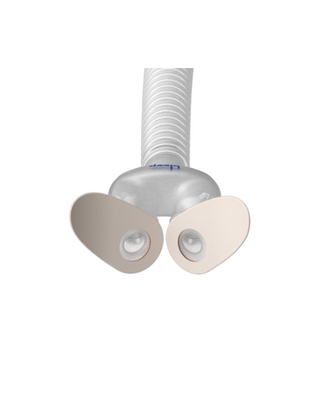 Unlike a traditional CPAP mask, the lightweight, flexible DreamPort™ Sleep Solution from Bleep totally eliminates the need for intrusive straps or a headgear. The patented solution utilizes a disposable, hypoallergenic adhesive strip that holds the DreamPorts™ (seals) in place. The device is fast and easy to apply and works with your existing CPAP machine. The strong, adhesive seal means fewer leaks and disruptions than with a nasal pillow or cushion masks. Users retain a wide open field of vision and full freedom of movement to sleep on their back, side, or stomach