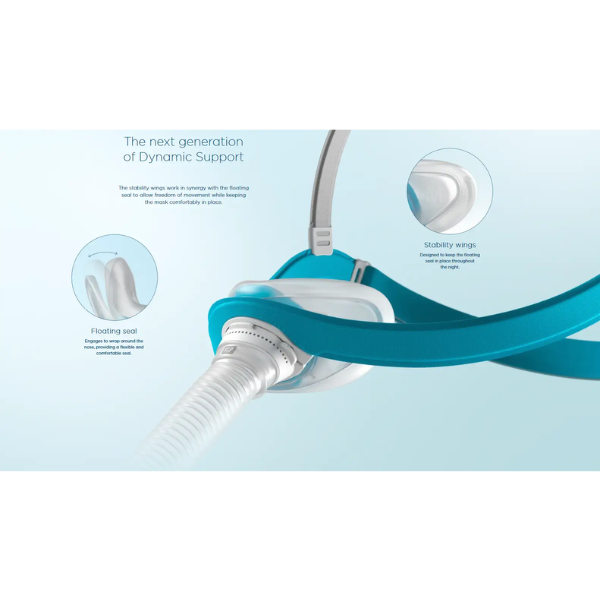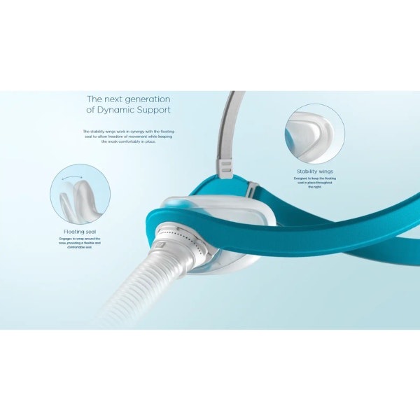 Soft floating seal that sits comfortably under the nose to create an unobtrusive seal