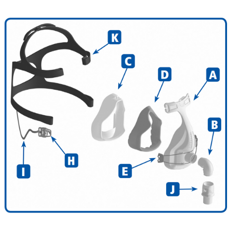 - Push the Non-Rebreathing Valve (J) onto the Elbow (B), and attach to Mask Base.