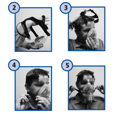 - Lightly hold the mask against your face, with the bottom of the Silicone Seal under your chin, and spread the Headgear over your head with your free hand.