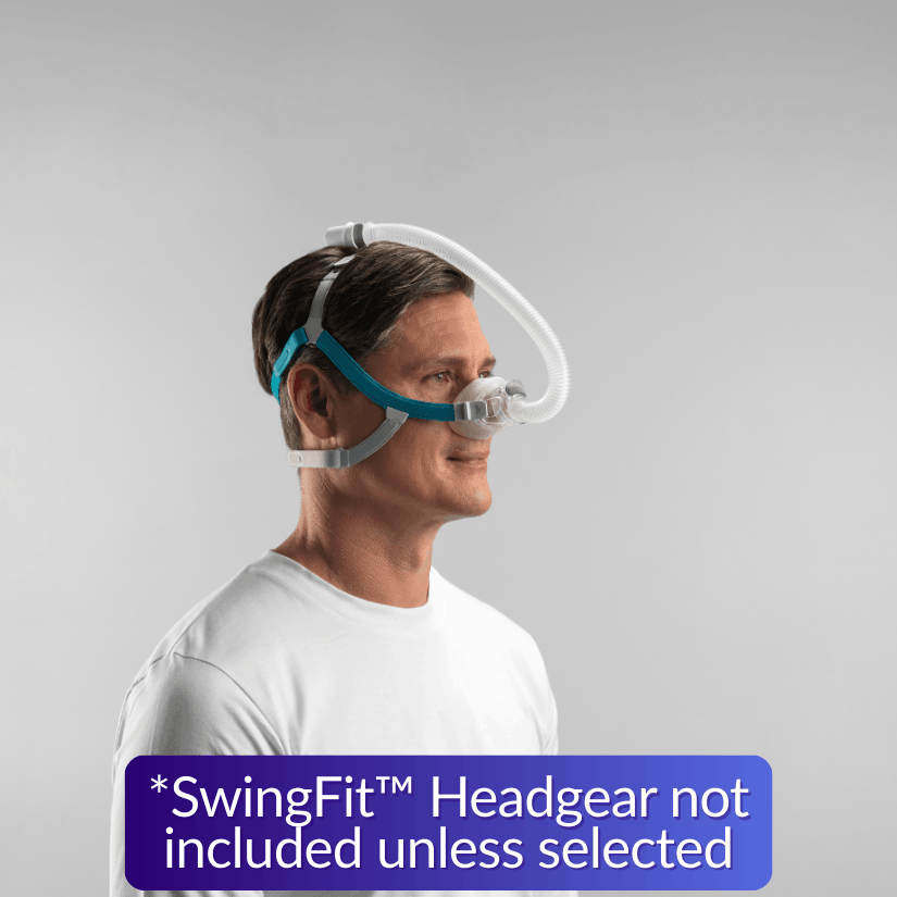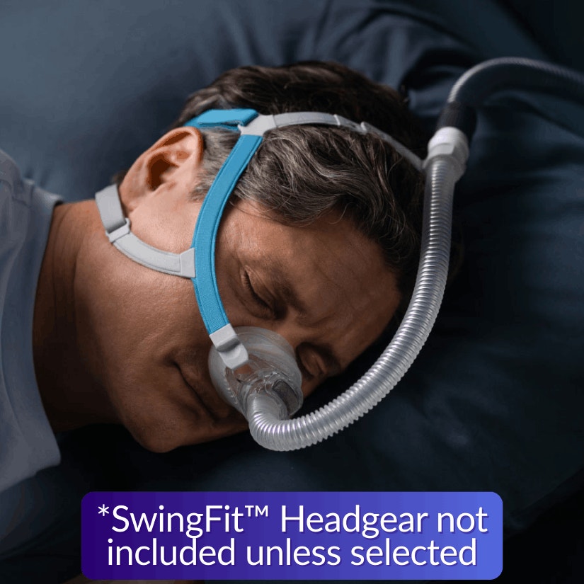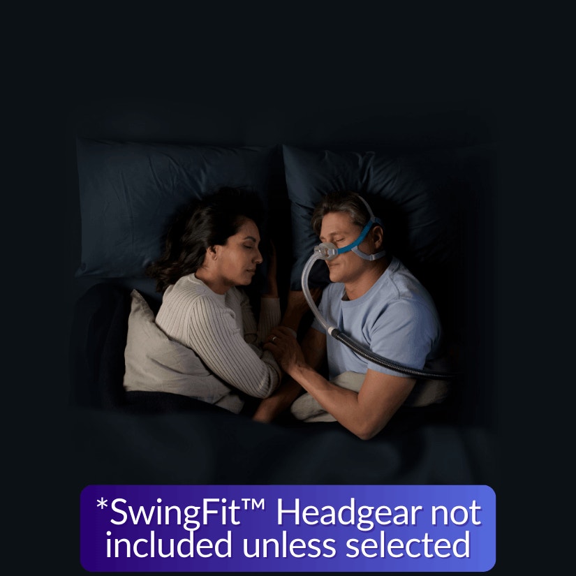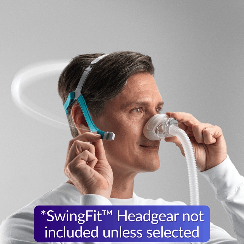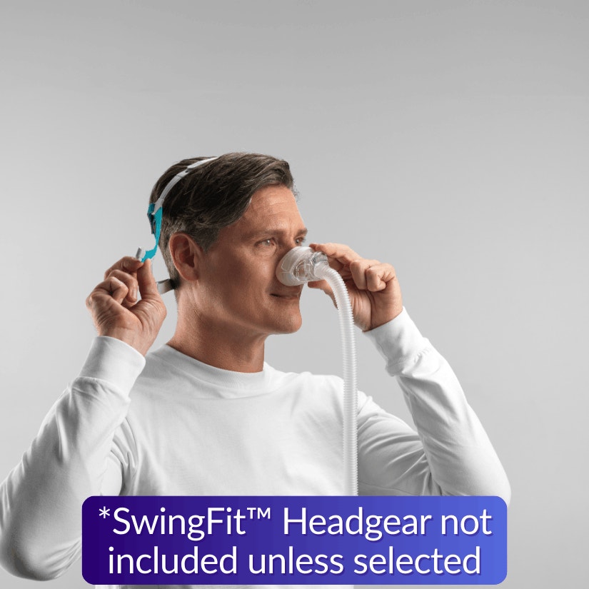 The SwingFit™ headgear is designed with rigid side arms to provide a clear field of view, and enable you to swing the headgear around your head while preventing your air tubing from tangling.