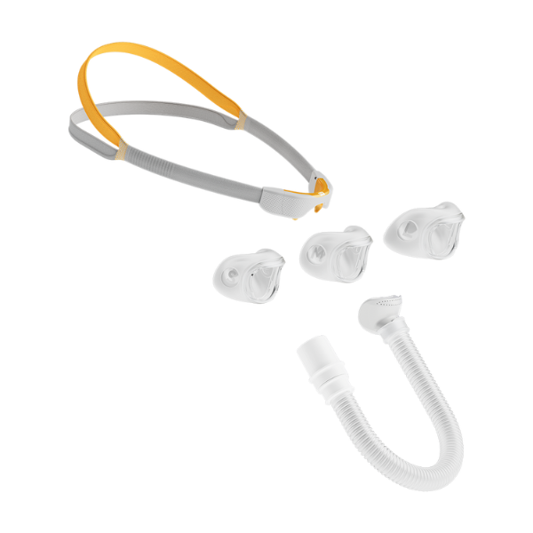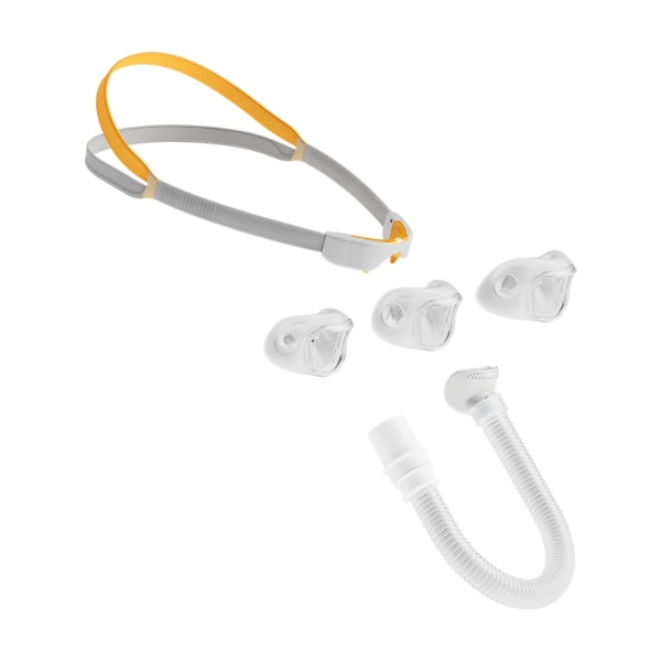 The Solo™ Nasal Pillow Fit Pack includes the Solo™ mask, three nasal pillow cushion sizes (Small, Medium, Large), headgear, short tube and swivel.