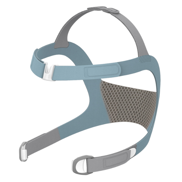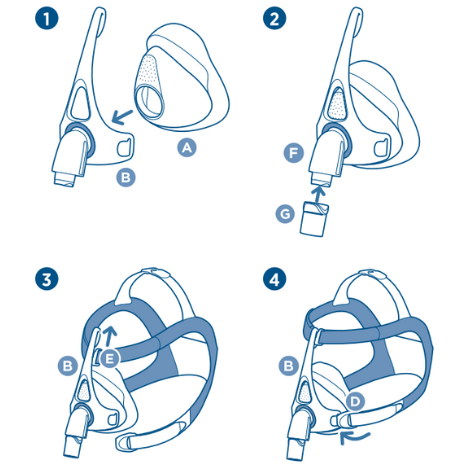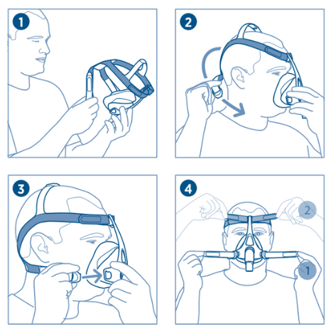 - Gently tighten the Headgear straps of the Headgear starting with the bottom straps, followed by loosely fitting the blue forehead straps.