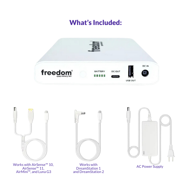 Experience portability and convenience with the full Freedom CPAP Battery 160 Backup Power Supply. This kit includes everything you need to ensure you get your CPAP treatment anywhere, anytime!