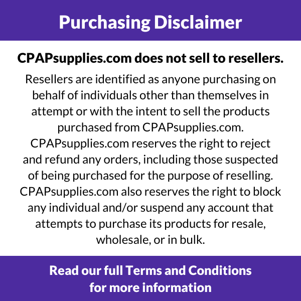 Purchasing Disclaimer: CPAPsupplies.com does not sell to resellers. Resellers are identified as anyone purchasing on behalf of individuals other than themselves in attempt or with the intent to sell the products purchased from CPAPsupplies.com. CPAPsupplies.com reserves the right to reject and refund any orders, including those suspected of being purchased for the purpose of reselling. CPAPsupplies.com also reserves the right to block any individual and/or suspend any account that attempts to purchase its products for resale, wholesale, or in bulk. Read our full Terms and Conditions for more information here.