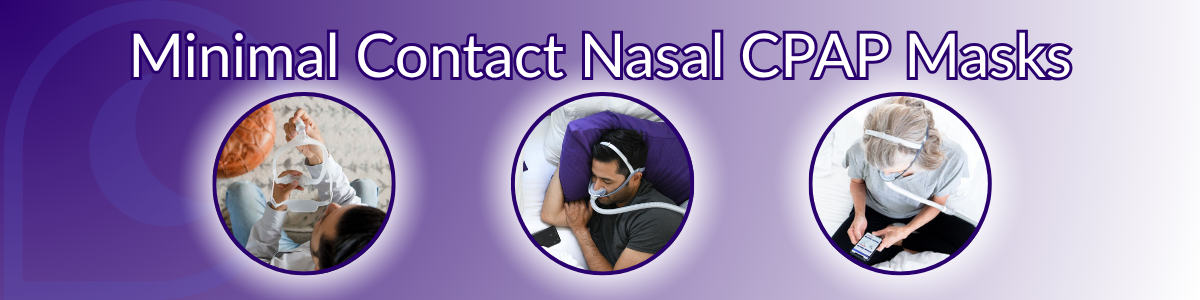 Minimal contact nasal CPAP masks are designed to deliver CPAP therapy while offering the least amount of facial contact as possible. Focusing on comfort, freedom of movement, and an enhanced field of vision—minimal contact masks provide a less intrusive sleep apnea therapy experience for CPAP users who feel less comfortable in traditional nasal or full face CPAP masks.