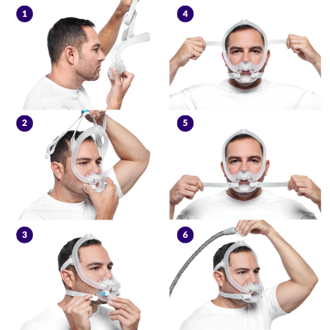 - Place the oral cushion over your mouth. Ensure both pillows and oral cushion sits comfortably against your face. Align the pillows under your nose so that it sits securely inside your nostrils. With the Resmed logo on the headgear facing up, pull the headgear and frame over your head.
