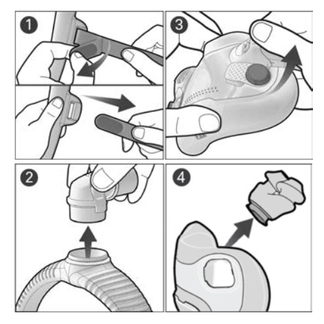 - Undo the fastening tabs on the upper headgear straps and pull from the frame. Keep the magnetic clips attached to the lower headgear straps.