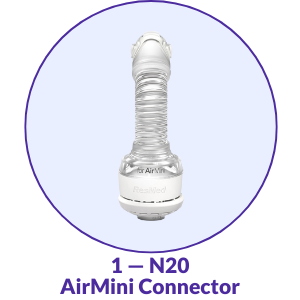 This is the piece that connects the Resmed AirFit™/AirTouch™ N20 Nasal Pillows Mask or the Resmed N30 Nasal Mask with the Resmed AirMini™ CPAP Tubing. This connector can be used with or without the HumidX Packs. This connector is compatible with the Resmed N20 Mask and the AirFit™ N30 Nasal Mask.
