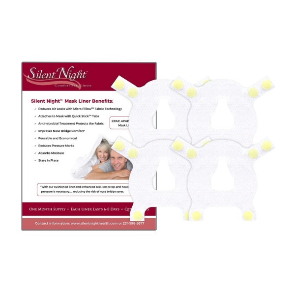 Silent Night Nasal CPAP Mask Liners are designed to help prevent air leaks and pressure marks. The liners are "One Size Fits Most" and fit a majority of nasal masks. The Micro Pillow™ fabric protects the skin from moisture accumulation, firm mask lines, and sores due to an overtightened mask. To keep their positioning throughout the night, Quick Stick™ adhesive tabs were integrated into the unique design. Each liner lasts between six to eight days, so this pack of four is expected to last about a month.