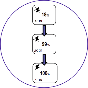 While the battery is charging, a green flashing lightning symbol (shown in image to the right/below) and the words "AC IN" will appear on the display. The battery charge percentage will increase. When the battery is fully charged, the lightning symbol is solid and no longer flashes.